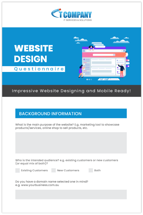 Our website design services questionnaire is the perfect tool to help you create the website of your dreams. From design preferences to functionality needs, our questionnaire will cover all the essential aspects of website development, ensuring you receive a website that meets all your requirements. Get started today!